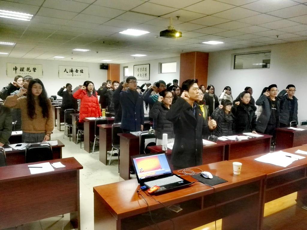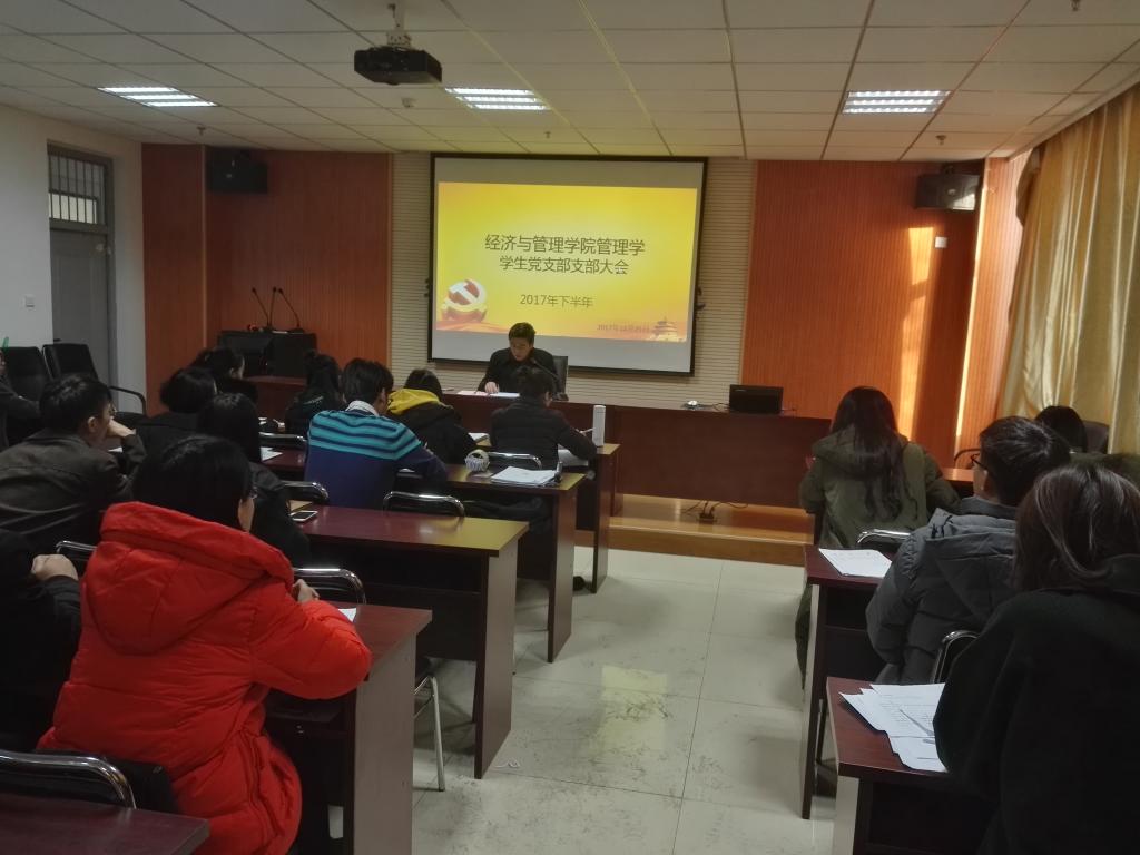 管理学学生党支部于2017年12月25日下午3:00点在15号楼南楼301会议室召开本学期的党支部大会。会议由管理学学生党支部书记那鹏飞主持召开,全体正式党员、预备党员、发展对象共47人参加本次会议。
