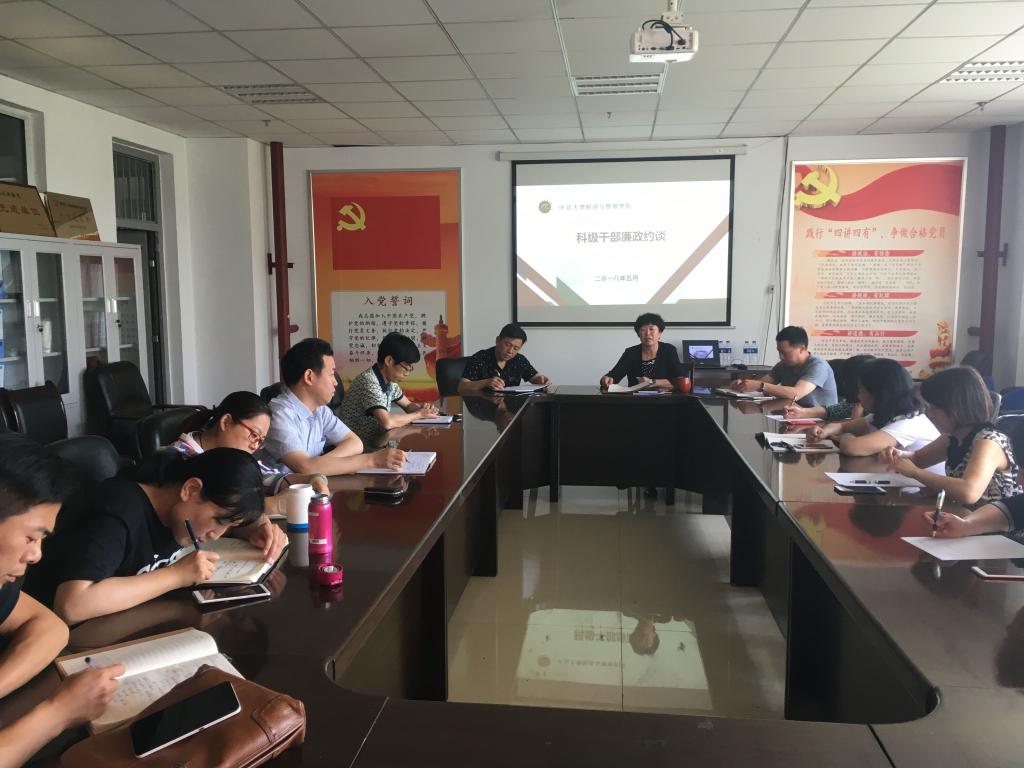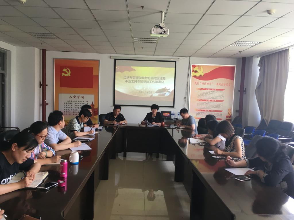 5月18日上午,在逸夫楼南楼308会议室经济与管理学院召开教育领域腐败和不正之风整治工作推进会,学院的全体领导、院党委委员、各科室负责人参加了会议。院领导对学院开展教育领域腐败和不正之风整治工作进行了安排部署,并对学院科级干部进行集体廉政谈话。
