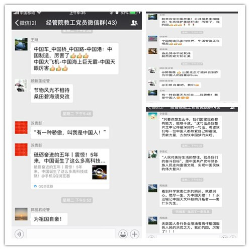 观看中广大教师激情满怀、自豪感溢于言表。观影后纷纷在经管院微信群中发表感言,为祖国的强大而骄傲、作为一名中国人而自豪,把从影片中得到的启示转化为实实在在的精神动力,立足本职,砥砺奋进,以更高的热情和更强的责任感扎实推进教学工作,决心要为中国更加美丽富强做出自己的贡献。